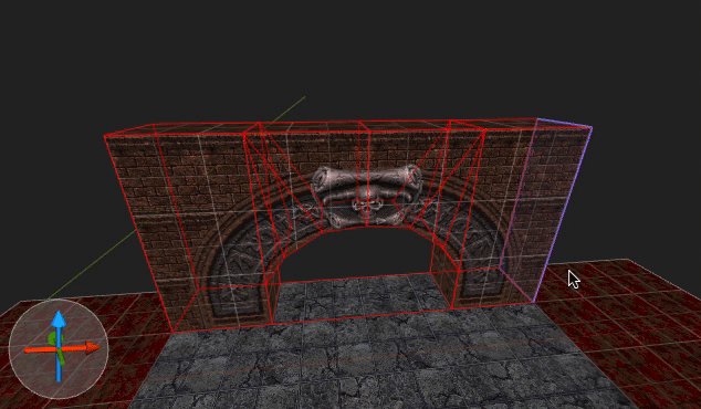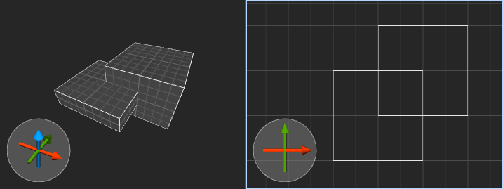 The editing area is divided in two sections: The context sensitive info bar at the top and the viewports below. The info bar contains different controls depending on which tool is currently activated. You can switch between tools such as the rotate tool and the vertex tool using the toolbar buttons, the menu or with the respective keyboard shortcuts. The context sensitive controls allow you to perform certain actions that are relevant to the current tool such as setting the rotation center when in the rotate tool or moving objects by a given delta when in the default move tool. Additonally, there is a button labeled “View” on the right of the info bar. Clicking on this button unfolds a dropdown containing controls to filter out certain objects in the viewports or to change how the viewport renders its contents.