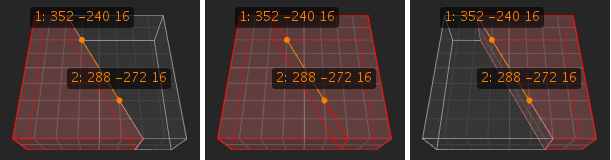 The normal of the plane is in the direction of the cross product of v1 and v2. In the diagram above, the plane normal points towards you. Together with its normal, the plane divides three dimensional space into two half spaces: The upper half space above the plane, and the lower half space below the plane. In this interpretation, the volume of the brush is the intersection of the lower half spaces defined by the face planes. This way of defining brushes has the advantage that all brushes are automatically convex. However, this representation of brushes does not directly contain any other geometric information of the brush, particularly its vertices, edges, and facets, which must be computed from the plane representation. In TrenchBroom, the vertices, edges, and facets are called the brush geometry. TrenchBroom uses the same method as the BSP compilers to compute the brush geometry. Having the brush geometry is necessary mainly for two things: Rendering and vertex editing.