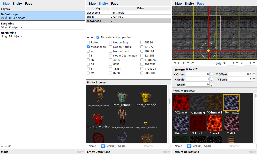 The Map Inspector allows you to edit layers and to set up which game modifications (mods) you are working with. The Entity Inspector is the tool of choice to change the properties of entities. It also contains an entity browser that allows you to create new entities by dragging them from the browser to a viewport and it allows you to set up entity definitions. Additionally, you can manage entity definition files in the entity inspector. The face inspector is used to edit the attributes of the currently selected faces. At the top, it has a graphical UV editor. Below that, you can edit the face attributes directly by editing their values. To select a texture for the currently selected faces, you can use the texture browser. Finally, the face inspector allows you to manage your texture collections.