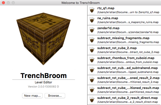 The first thing you will see when TrenchBroom starts is the welcome window. This window allows you to open one of your most recently edited maps, to create a new map or to browse your computer for an existing map you wish to open in TrenchBroom.