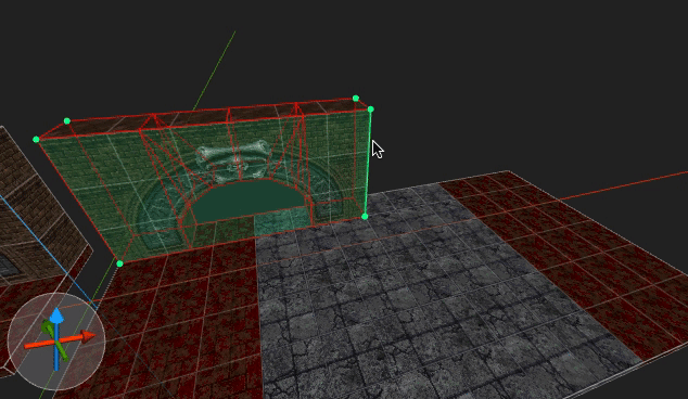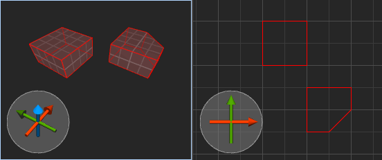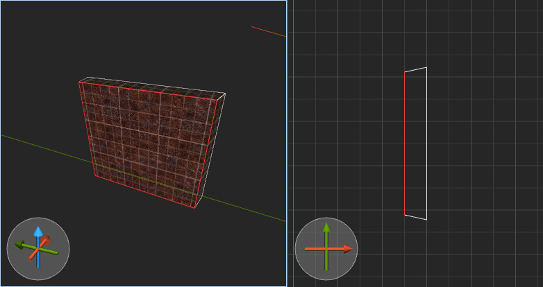 The editing area is divided in two sections: The context sensitive info bar at the top and the viewports below. The info bar contains different controls depending on which tool is currently activated. You can switch between tools such as the rotate tool and the vertex tool using the toolbar buttons, the menu or with the respective keyboard shortcuts. The context sensitive controls allow you to perform certain actions that are relevant to the current tool such as setting the rotation center when in the rotate tool or moving objects by a given delta when in the default move tool. Additonally, there is a button labeled “View” on the right of the info bar. Clicking on this button unfolds a dropdown containing controls to filter out certain objects in the viewports or to change how the viewport renders its contents.